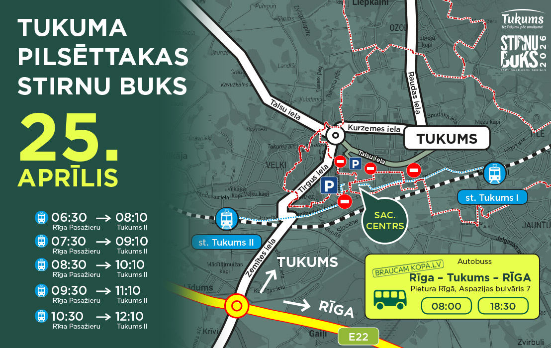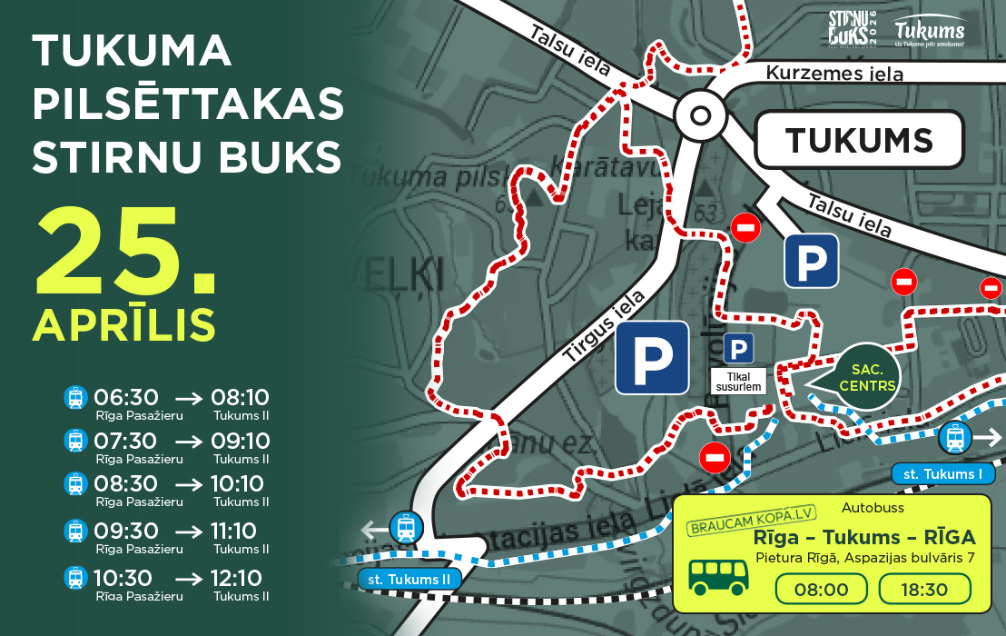 Ņem vērā, ka Tukuma vecpilsētā tiks noteikti satiksmes ierobežojumi, tāpēc Tukumā iesakām ierasties caur otro šosejas Rīga - Ventspils apļveida krustojumu (dzelzceļa stacija 'Tukums II' jeb lauķenes apli tukumnieku valodā).