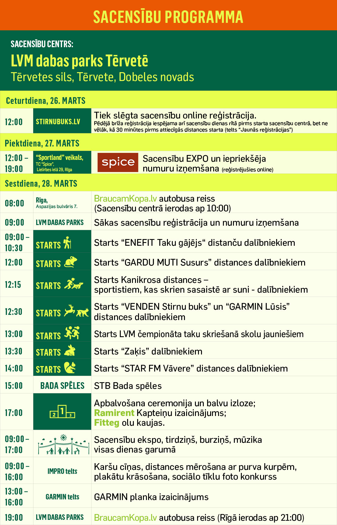 Pēdējā brīža reģistrācija iespējama arī sacensību dienas rītā sacensību centrā pirms starta, bet ne vēlāk kā 30 minūtes pirms attiecīgās distances starta (telts “Jaunās reģistrācijas”).